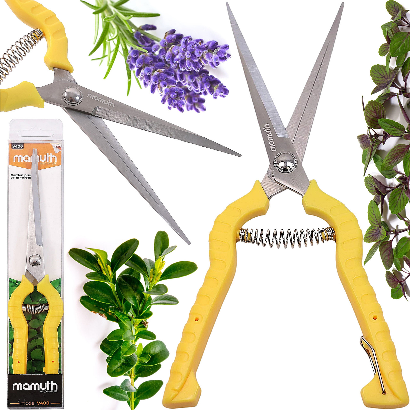 Sekator ogrodniczy V400 MAMUTH – Bardzo długie nożyce do przycinania Precyzyjny sekator V400 marki MAMUTH to niezawodne narzędzie ogrodnicze przeznaczone do cięcia roślin, ziół, krzewów i drobnych gałęzi. Wykonany ze stali nierdzewnej, zapewnia trwałość, ostrość i odporność na korozję. Dzięki długiemu ostrzu i ergonomicznym rączkom pozwala na wygodne i precyzyjne cięcie nawet w trudno dostępnych miejscach.