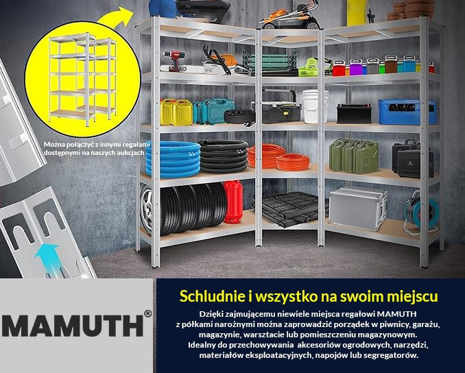 Regał narożny RK-30 MAMUTH nie tylko świetnie sprawdza się w magazynach i garażach, ale także w biurach i domach. Jego nowoczesny design i wytrzymałość sprawiają, że jest to uniwersalne rozwiązanie do przechowywania, które można dostosować do różnych potrzeb i przestrzeni.
